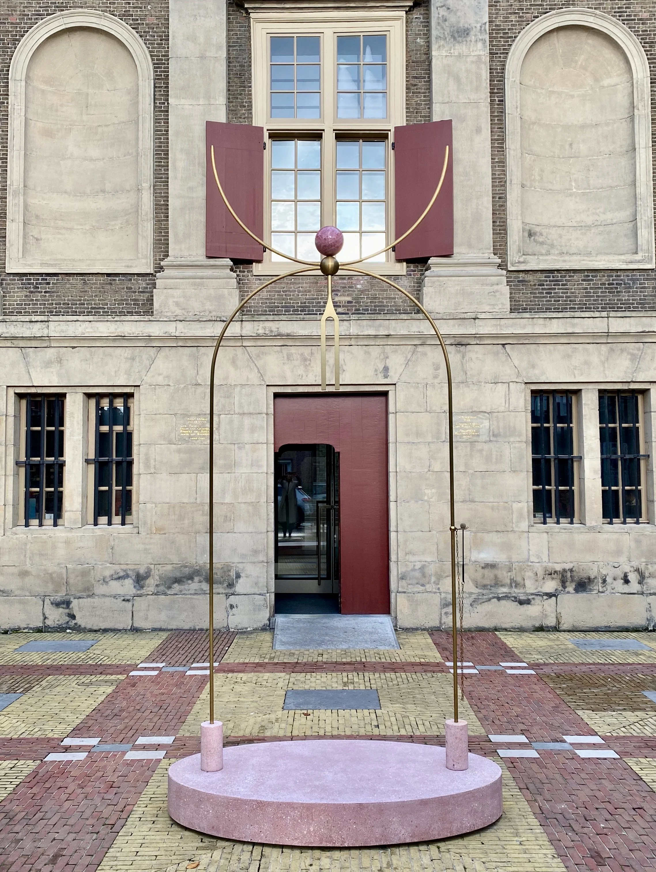 brass, anodized aluminium (tuning fork), rose quartz, terrazzo